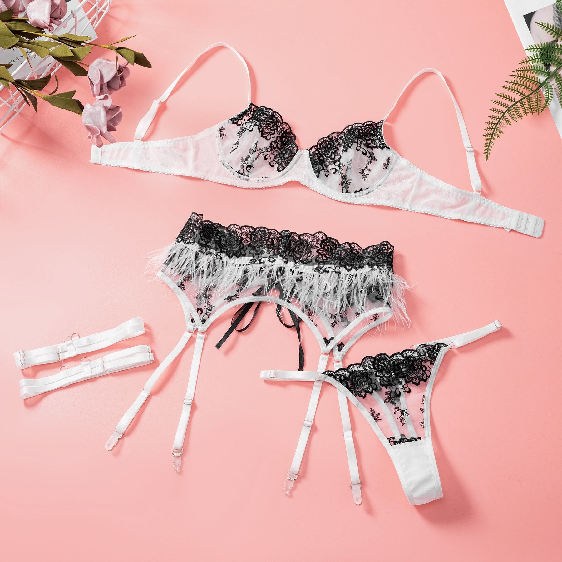 This alluring black lingerie set features an intricately embroidered bra adorned with floral and feather motifs, designed to enhance sensuality and elegance. Crafted for a perfect fit, it combines seductive style with expert detailing to elevate your intimate wardrobe.