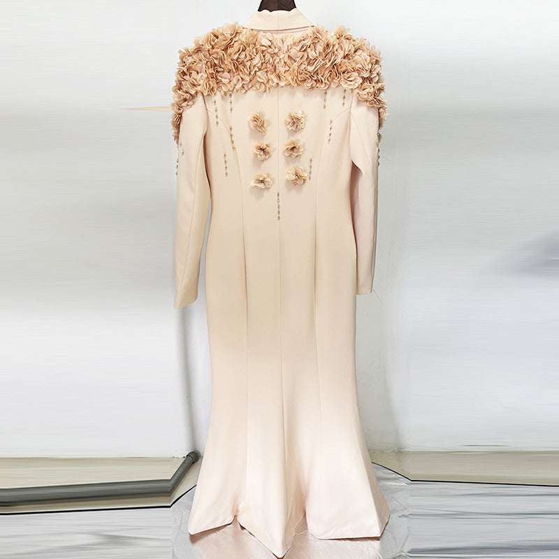 Elevate your formal wardrobe with this sophisticated long skirt, inspired by European and American celebrity styling. Featuring intricate beadwork and dimensional floral embellishments at the neckline, this piece showcases expert craftsmanship in high-fashion design. The striking green fruit-inspired collar detail adds a distinctive touch, while the flowing silhouette delivers timeless elegance for special occasions and up